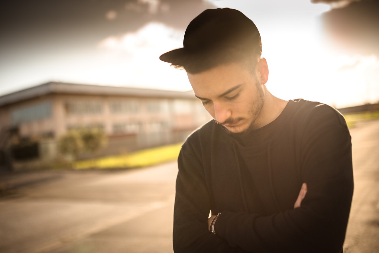 Ung, svartkledd mann med caps ser ned i bakken