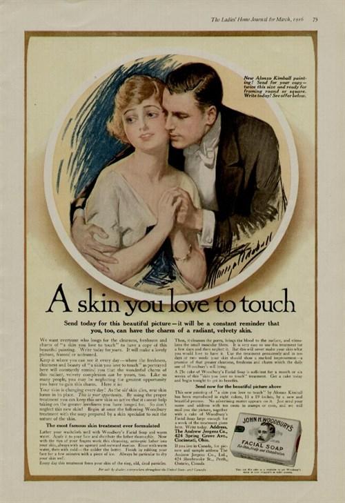 Reklamen for Woodbury-såpen ble til etter at kvinneavdelingen hadde gjort intervjuer, laboratoriestudier og innhentet råd fra leger. Slagordet ble «A skin you love to touch», og såpen skulle motvirke stygge porer, rød hud og fregner.