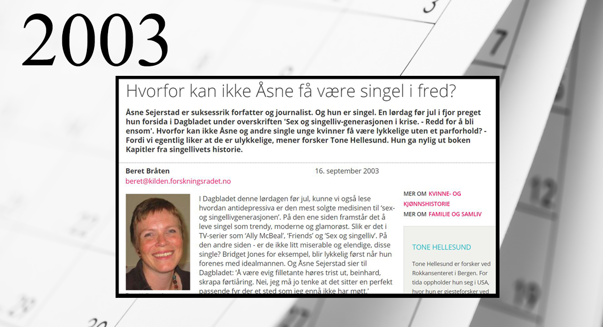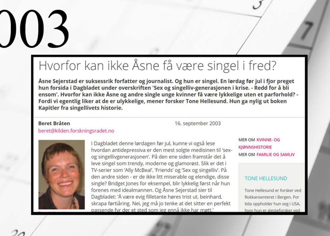 Artikkelen fra arkivet er fra 2003. Den handler om single kvinners status. Fra peppermøenes tid på slutten av 1800-tallet og frem til 1950-tallets familieideologi, hvor single ikke lenger var like betydningsfulle. Det er et intervju med Tone Hellesund, som nettopp hadde skrevet en doktorgrad om emnet. Men hva mener Hellesund, som er professor ved Universitetet i Bergen, i dag? Er det større aksept for å være singel kvinne?