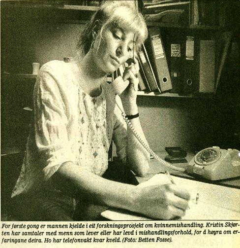 På et av avisklipene Skjørten har funnet frem i anledning Kildens besøk, ser man en ung Kristin Skjørten på et kontor med en gammeldags dreieskivetelefon og en notatblokk for hånda. Til Stavanger Aftenblad uttalte hun: «Siktemålet er klart: Jo mer vi vet om bakgrunnen for mishandlingen, desto lettere blir det å finne veier til å få slutt på volden.»