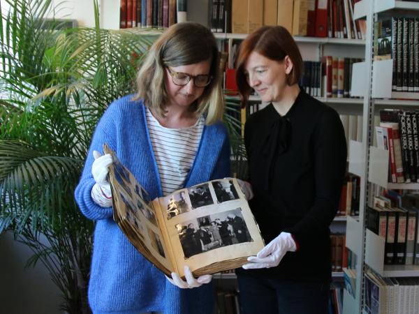De sitter ved et rundt bord og blar forsiktig i et digert fotoalbum. På hendene har de hvite hansker som skal beskytte arkivmaterialet. Albumet har tilhørt Sissel Lie (1922–1983). Hun tjenestegjorde i Skottland under krigen og var datter av Trygve Lie, FNs første generalsekretær.