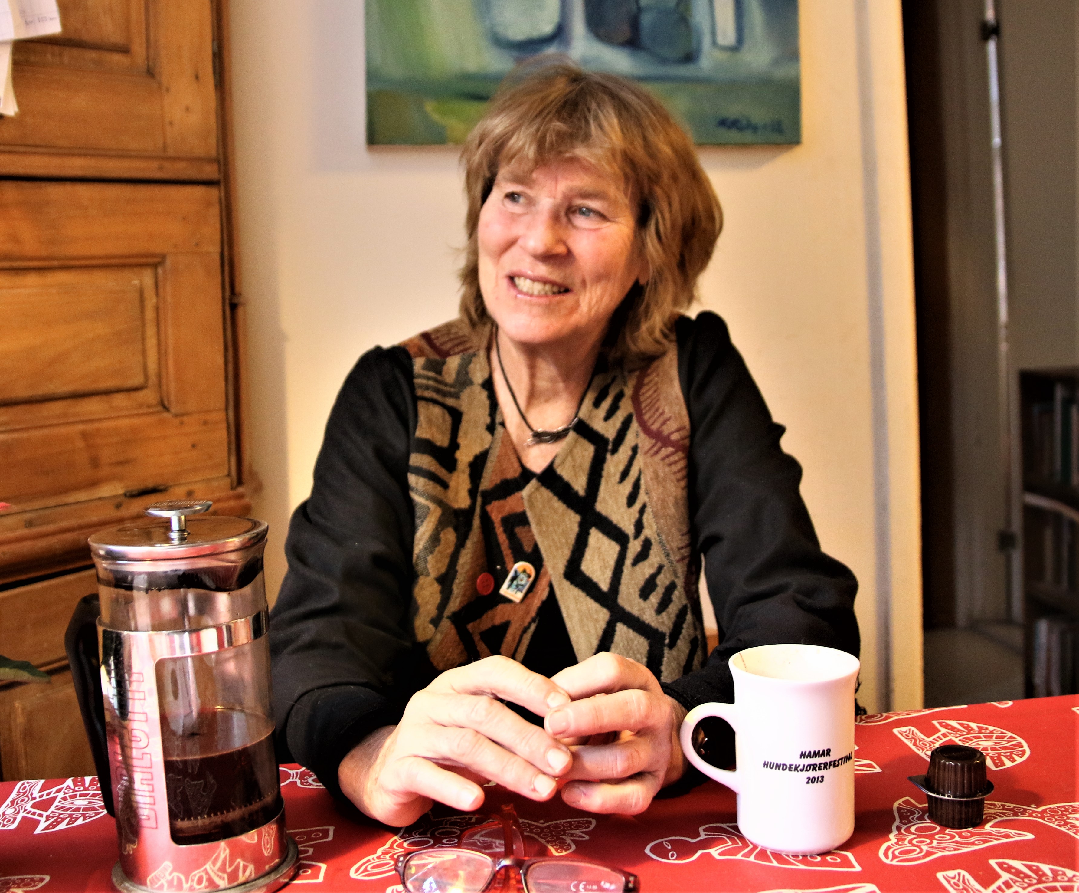 Vi setter oss ved kjøkkenbordet. Sundby skjenker presskannekaffe i store krus. Bak henne står et gammelt trehvitt hjørneskap, og over henne henger et blått oljemaleri.