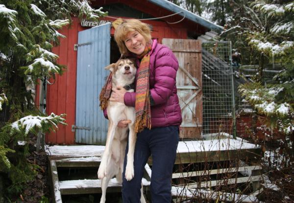 Jeg klapper de to huskyene som stikker snuten frem mellom bena på sin matmor. Til sammen eier Sundby 13 trekkhunder.