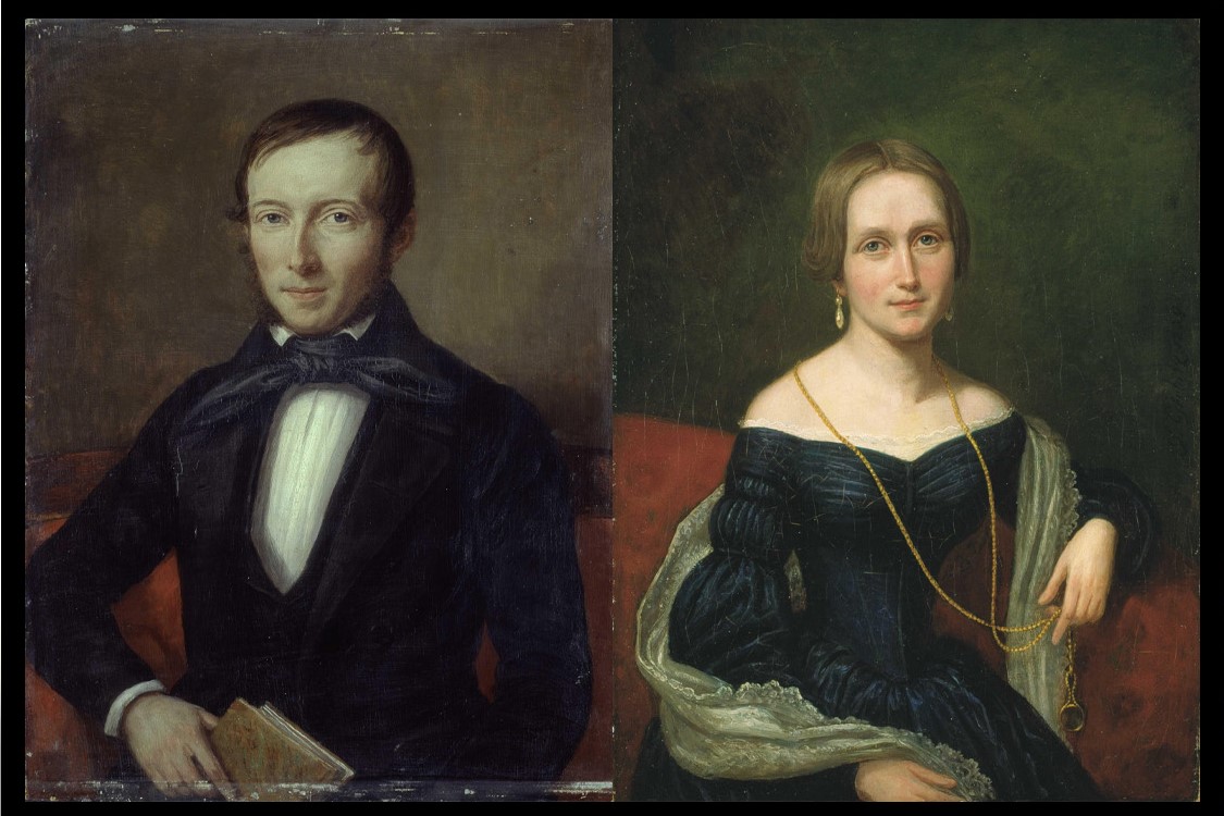 Vi stopper foran et glassmonter med to malerier, ett av Camilla Collett og ett av ektemannen Jonas Collett. Foran portrettene, ligger et par gammeldagse briller, en såkalt lorgnett.