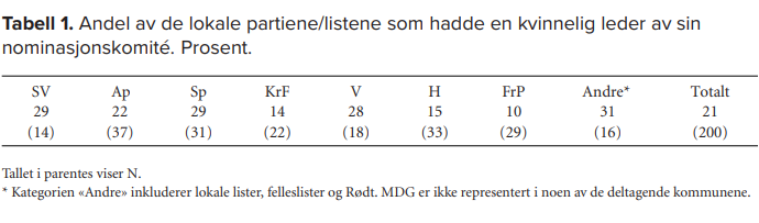 Ser vi på hvilket kjønn nominasjonskomiteens leder hadde, blir inntrykket et annet. På tvers av partiene hadde bare 21 prosent av komiteene en kvinnelig leder. Det framgår av Tabell 1, som også viser at andelen med kvinnelig leder varierer fra 10 prosent blant FrPs nominasjonskomiteer til litt under 30 prosent i SV, Sp og Venstre. Mannsdominansen blant nominasjonskomiteenes ledere er med andre ord sterk i disse kommunene – som altså har valgt å vie lav kvinnerepresentasjon spesiell oppmerksomhet.