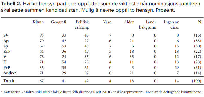 At kjønn konkurrerer med andre hensyn når valglister skal settes sammen og toppkandidater skal utpekes, er et eget fokus i forskningslitteraturen om kvinner i politikk (Kjær og Kosiara-Pedersen 2018; Kjær og Krook 2019). Politisk erfaring og kompetanse (ofte målt som å være sittende representant) er tradisjonelt det som trekkes frem som den ene faktoren som trumfer kjønn og dermed forklarer kjønnsulikheten i representasjon, da menn generelt har mer politisk erfaring enn kvinner (Kjær og Krook 2019). Særlig gjelder dette når topplasseringene på listene skal fordeles (Aars og Christensen 2011). Kjønn er på den andre siden det viktigste representativitetshensynet for partiene. I tillegg er også geografisk tilhørighet og alder sentrale kriterier i sammensetningen av valglisten sett under ett (Aars og Christensen 2011; Kjær og Krook 2019:8). At partifarge spiller inn for hvilke kriterier som vurderes som viktig, er det ingen tvil om, men forskningen indikerer også at uansett partifarge er det en kjensgjerning at nominasjonskomiteer som regel domineres av menn og at kvinnen ofte er en god nummer to i konkurransen med mannen: Toppkandidaten er oftere en mann enn en kvinne mens kvinnen er «en ‘god nummer to’» (van der Ros, Johansen og Guldvik (2010:243).