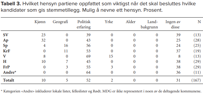 | 4 | Riktignok har vi i undersøkelsen spesifisert spørsmålet til å gjelde tildeling av stemmetillegg og ikke de øverste plassene generelt, men dette har liten praktisk betydning. Det er stemmetillegget som viser hvilke kandidater partiene ser på som særlig høyt prioriterte. |